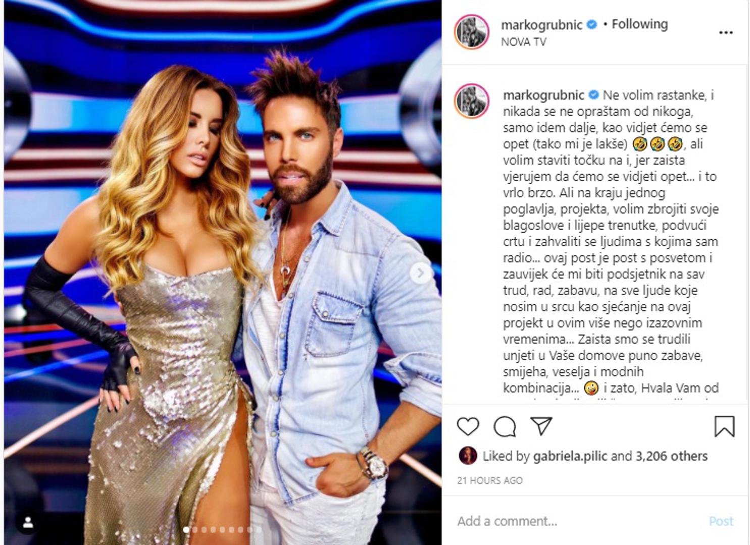 Modni stilist Marko Grubnić sudjelovao je u ovogodišnjoj sezoni showa "Tvoje lice zvuči poznato", a završetak showa motivirao ga je da se na Instagramu oprosti od kolega.