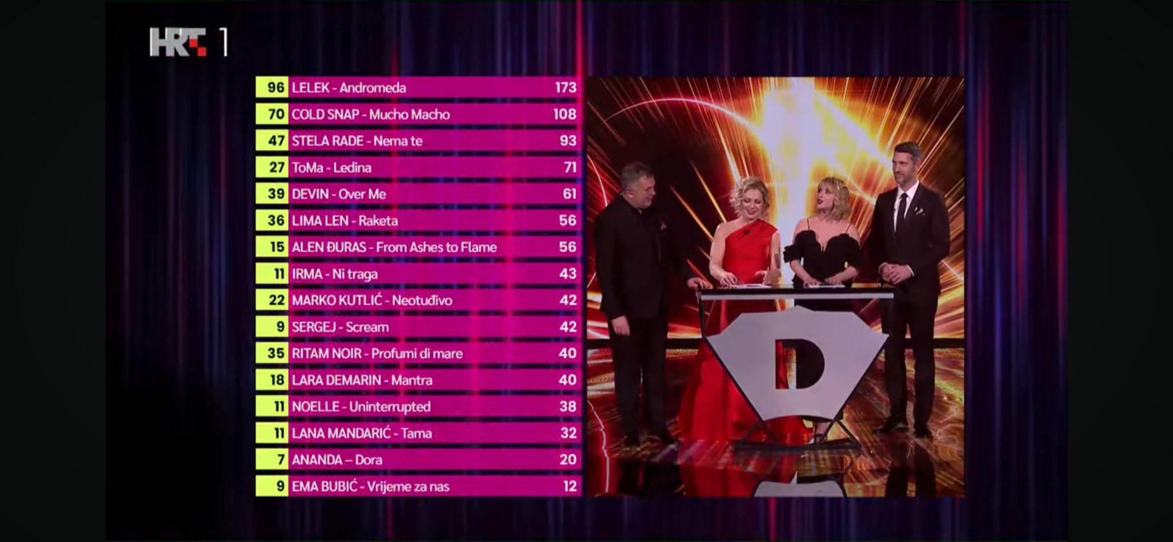 FOTO Evo tko se sve plasirao u finale Dore: Ovih 16 izvođača slušamo u nedjeljuGrupa LELEK dobila je najviše glasova publike, ali i bodova žirija! Ove godine hrvatskog predstavnika birali su stručni žiriji iz HRT-ovih centara Zagreb, Rijeka, Split i Osijek te četiri međunarodna žirija, a oni su bili iz Ujedinjenog Kraljevstva, San Marina, Norveške i Luksemburga. Glasovi publike i žirija gledali su se u omjeru 50:50, dok se u polufinalnim večerima, koje su se odvile u četvrtak i petak, pitalo samo publiku.