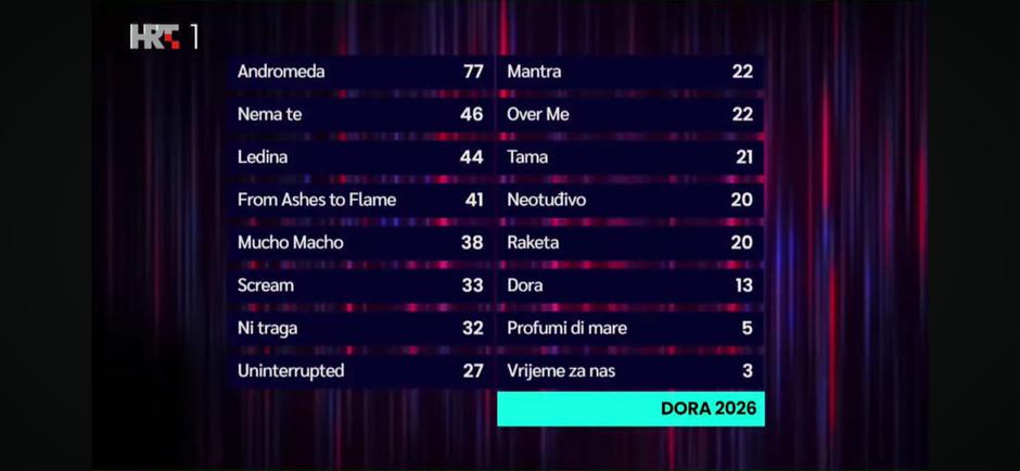 21:30 Pjesmu "Andromeda" izvodi grupa LELEK, a upravo one, po mnogim eurovizijskim znalcima, slove kao favoritkinje za pobjedu na Dori ove godine. Grupa je privukla pozornost publike moćnom i atmosferičnom pričom iza koje se krije posebna inspiracija i snažna emocija. Dodajmo i da su već nastupale na Dori, a prošle godine završile su kao četvrte.