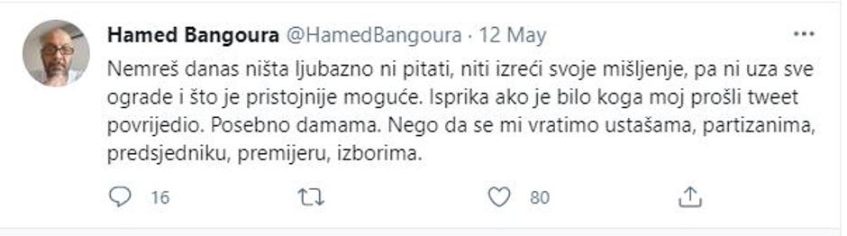 "Nemreš danas ništa ljubazno ni pitati, niti izreći svoje mišljenje, pa ni uza sve ograde i što je pristojnije moguće. Isprika ako je bilo koga moj prošli tweet povrijedio. Posebno damama. Nego da se mi vratimo ustašama, partizanima, predsjedniku, premijeru, izborima", napisao je Bangoura.