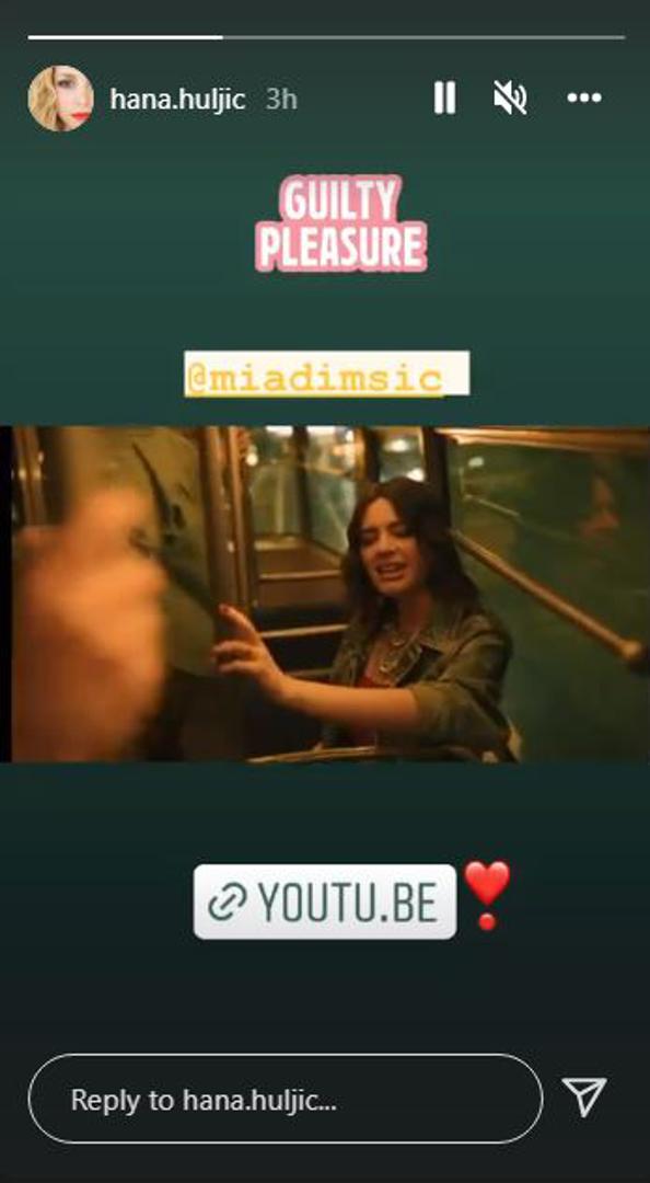 No, ipak tu i tamo napravi iznimku, poput posljednjeg Instagram Storyja u kojemu je podržala svoju prijateljicu i kolegicu Miu Dimšić i njezin novi spot za pjesmu 'Guilty Pleasure' s kojom će nam predstavljati na Eurosongu ove godine. Hana je podijelila isječak iz Mijina spota te je ostavila i link na video.