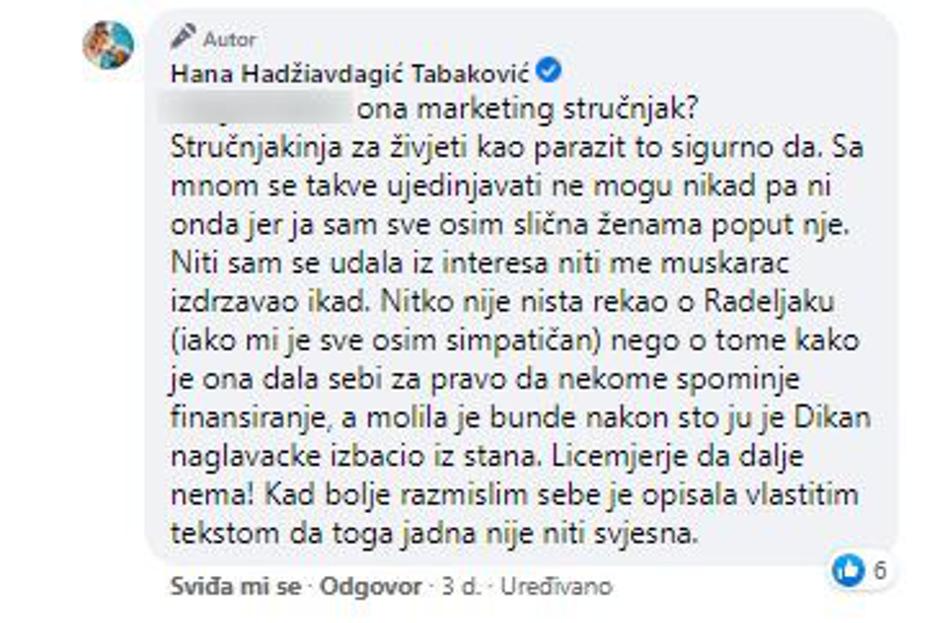 "Ona marketing stručnjak? Stručnjakinja za živjeti kao parazit to sigurno da. Sa mnom se takve ujedinjavati ne mogu nikad pa ni onda jer ja sam sve osim slična ženama poput nje. Niti sam se udala iz interesa niti me muškarac izdržavao ikad. Nitko nije ništa rekao o Radeljaku (iako mi je sve osim simpatičan) nego o tome kako je ona dala sebi za pravo da nekome spominje finansiranje, a molila je bunde nakon što ju je Dikan naglavačke izbacio iz stana. Licemjerje da dalje nema! Kad bolje razmislim sebe je opisala vlastitim tekstom da toga jadna nije niti svjesna", odgovorila je Hana pratiteljici.