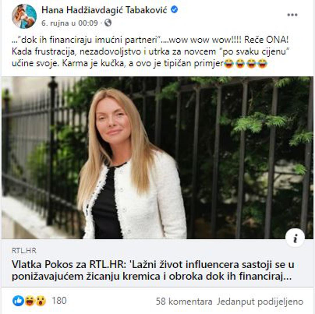 Ovaj se iskaz nije svidio influencerici i voditeljici Hani Hadžiavdagić Tabaković koja je podijelila post uz kojeg je napisala: