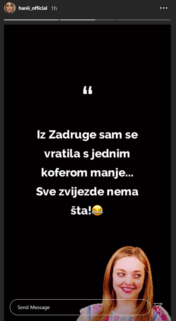 "Iz 'Zadruge' sam se vratila s jednim koferom manje. Sve zvijezde. Nema šta", poručila je ironično Rodić u još jednoj Instagram priči.