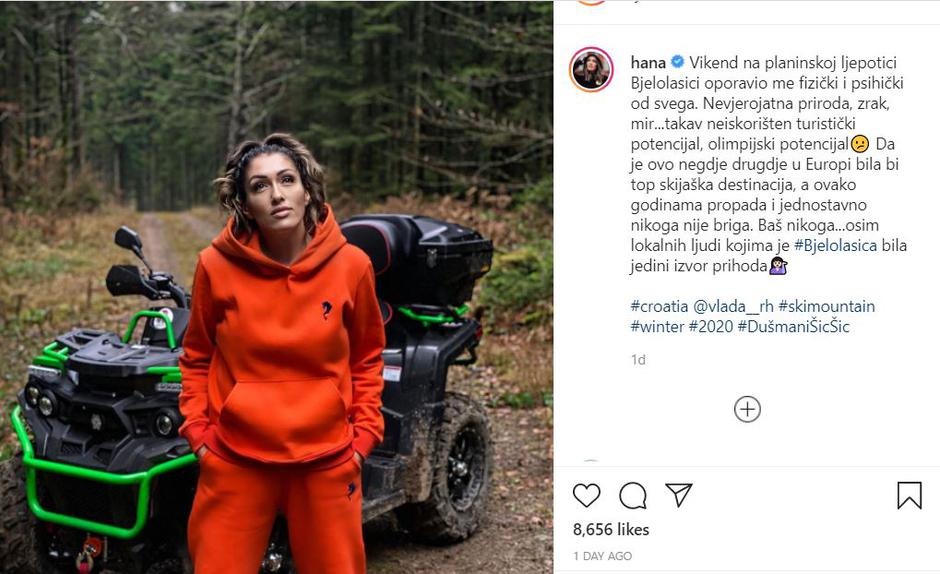 - Vikend na planinskoj ljepotici Bjelolasici oporavio me fizički i psihički od svega. Nevjerojatna priroda, zrak, mir...takav neiskorišten turistički potencijal, olimpijski potencijal. Da je ovo negdje drugdje u Europi bila bi top skijaška destinacija, a ovako godinama propada i jednostavno nikoga nije briga. Baš nikoga...osim lokalnih ljudi kojima je Bjelolasica bila jedini izvor prihoda - napisala je Hana.