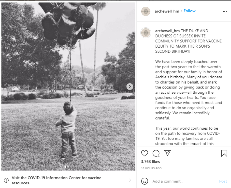 Vojvotkinja od Sussexa Meghan Markle (39) i princ Harry (36) na Instagram profilu svoje zaklade Archwell objavili su fotografiju dvogodišnjeg sina Archieja u povodu njegova drugog rođendana. U nizu fotografija, od kojih je prva crno-bijela i Archiejeva, zamolili su pratitelje da doniraju novac za cjepivo protiv koronavirusa namijenjeno siromašnijim, nerazvijenijim zemljama.