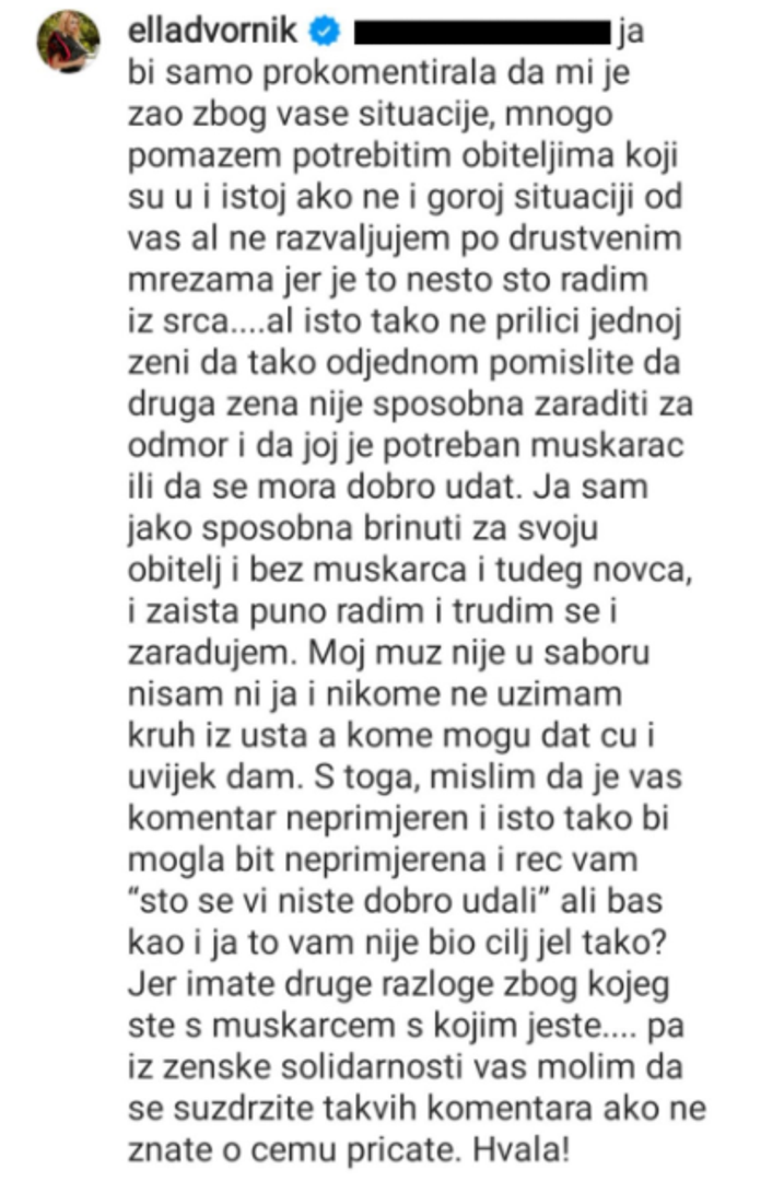 - Ja bi samo prokomentirala da mi je žao zbog vaše situacije. Mnogo pomažem potrebitim obiteljima koji su u i istoj, ako ne i goroj situaciji od vas, ali ne razvaljujem po društvenim mrežama jer je to nešto što radim iz srca. Ali, isto tako ne priliči jednoj ženi da tako odjednom pomislite da druga žena nije sposobna zaraditi za odmor i da joj je potreban muškarac ili da se mora dobro udat. Ja sam jako sposobna brinuti za svoju obitelj i bez muškarca i tuđeg novca, i zaista puno radim i trudim se i zarađujem. Moj suprug nije u saboru, a nisam ni ja, i nikome ne uzimam kruh iz usta, a kome mogu dat ću i uvijek dam. Stoga, mislim da je vaš komentar neprimjeren i isto tako bi mogla biti neprimjerena i reći vam 'što se vi niste dobro udali', ali baš kao i ja, to vam nije bio cilj - je l' tako? Jer imate druge razloge zbog kojih ste s muškarcem s kojim jeste. Pa iz ženske solidarnosti vas molim da se suzdržite takvih komentara ako ne znate o čemu pričate - zaključila je Ella te dobila enormnu podršku svojih pratitelja.
