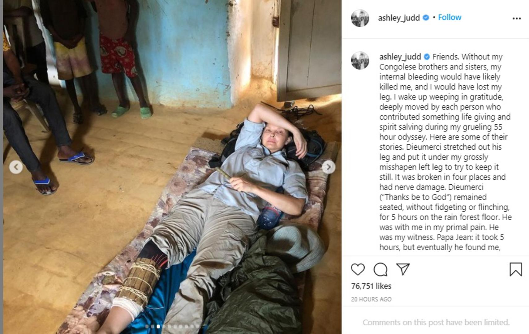 "Prijatelji. Bez moje braće i sestara iz Konga, moje unutarnje krvarenje vjerojatno bi me ubilo i izgubila bih nogu.Budim se plačući u znak zahvalnosti, duboko dirnuta svakom osobom koja je doprinijela nečemu što je dalo život i spasilo duh tijekom moje iscrpljujuće 55-satne odiseje ", rekla je u svojoj objavi na Instagramu.