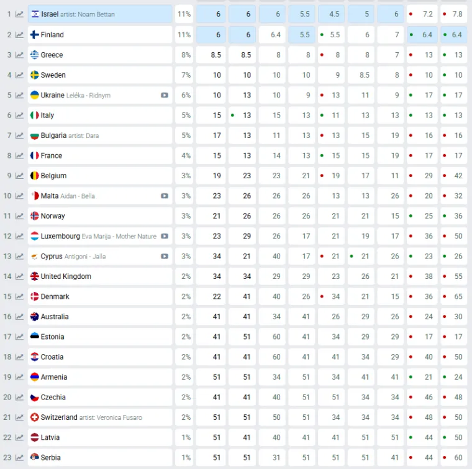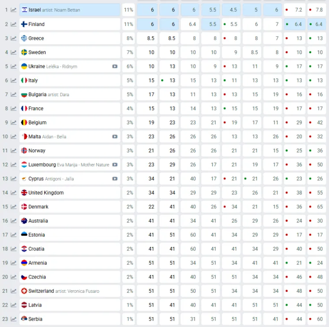 Prema trenutačnim predviđanjima, Izrael je u velikoj prednosti, s procijenjenim šansama za pobjedu od 11 posto, a njihovu pjesmu izvodi Noam Bettan. Na drugom mjestu nalazi se Finska, dok treće mjesto drži Grčka. Iza njih su Švedska i Ukrajina, koje se smještaju na četvrtu i petu poziciju. Na dnu ljestvice nalazi se Crna Gora, čija pjesma "Nova zora" u izvedbi Tamare Živković ima najmanje izgleda za uspjeh.