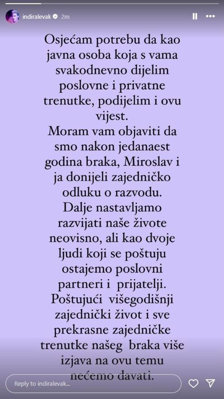 Vijest koja je danas odjeknula kao bomba u medijima je ona da se pjevačica Indira Levak nakon 11 godina braka razvodi od Miroslava Levaka. - Osjećam potrebu da kao javna osoba koja s vama svakodnevno dijeli poslovne i privatne trenutke, podijelim i ovu vijest. Moram vam objaviti da smo nakon 11 godina braka Miroslav i ja donijeli zajedničku odluku o razvodu. Dalje nastavljamo razvijati naše živote neovisno, ali kao dvoje ljudi koji se poštuju, ostajemo poslovni partneri i prijatelji. Poštujući višegodišnji zajednički život i sve prekrasne zajedničke trenutke našeg braka, više izjava na ovu temu nećemo davati - napisala je na društvenoj mreži Instagram popularna pjevačica Indira Levak i tako šokirala obožavatelje.