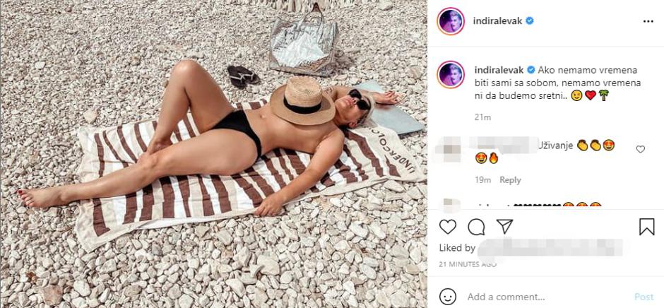 Pjevačica Indira Levak (47) na svojem je Instagram profilu podijelila fotografiju na kojoj pozira na plaži bez gornjeg dijela kupaćeg kostima. Na fotografiji ona leži na leđima na plaži, a grudi je prekrila šeširom. U opisu fotografije istaknula je važnost vremena provedenog sa samim sobom. "Ako nemamo vremena biti sami sa sobom, nemamo vremena ni da budemo sretni", napisala je Levak uz fotku te dodala emotikon srca, palme i onaj koji namiguje.