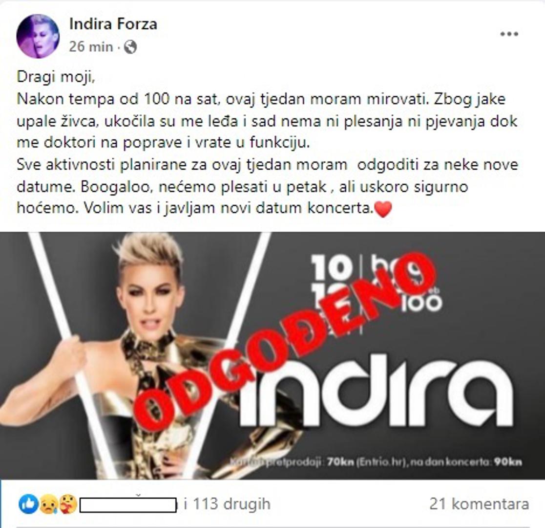 – Dragi moji, nakon tempa od 100 na sat, ovaj tjedan moram mirovati. Zbog jake upale živca, ukočila su me leđa i sad nema ni plesanja ni pjevanja dok me doktori ne poprave i ne vrate u funkciju. Sve aktivnosti planirane za ovaj tjedan moram odgoditi za neke nove datume. Boogaloo, nećemo plesati u petak, ali uskoro sigurno hoćemo. Volim vas i javljam novi datum koncerta – stoji u objavi na službenoj Facebook stranici Indira Forza.