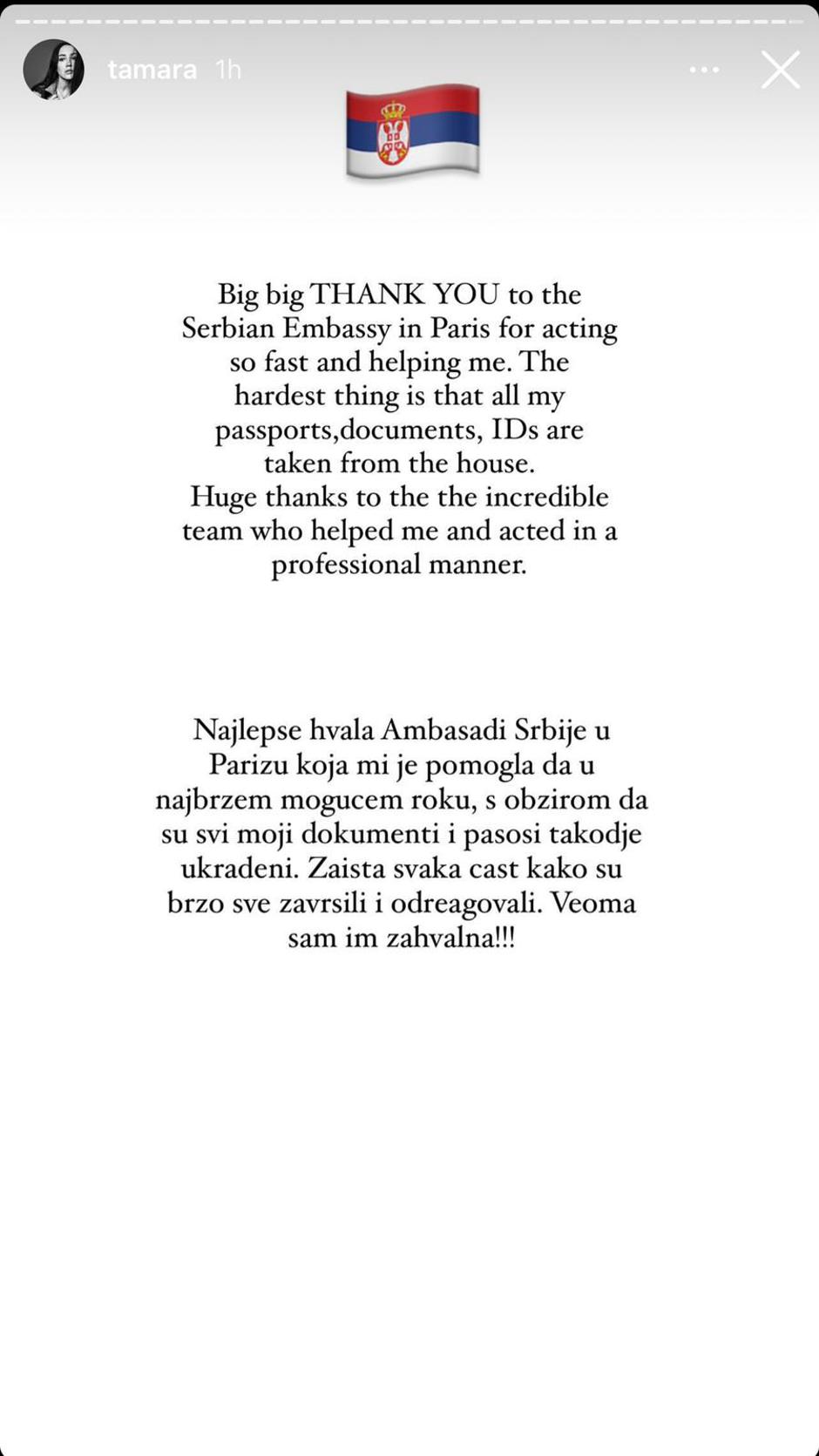 -Obično ne pričam o lošim stvarima koje mi se događaju, ali do sada nikada nisam bila žrtva ovakvog zločina, poručila je Tamara, a također se zahvalila i Ambasadi Srbije u Parizu koja joj je pomogla da u što kraćem roku dobije nove dokumente.