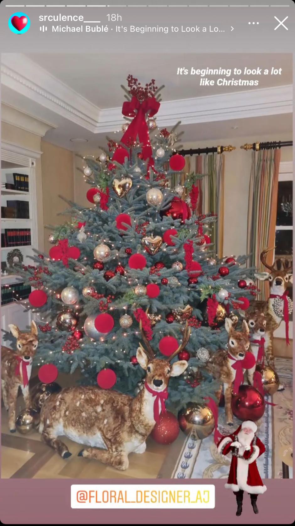 Bor je ukrašen crvenim mašnama, lampicama i kuglicama u zlatnoj i crvenoj boji, a oko bora su postavljene figure jelena koje su gotovo u prirodnoj veličini. Iva je pokazala i kako je dekorirala dnevni boravak, a osim raskošnog bora odabrala je i ogromni crveni vijenac od borovine koji je postavila iznad kamina.