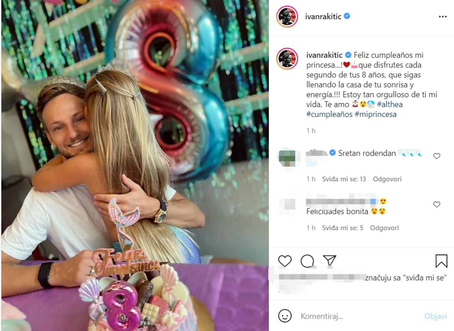 Nogometaš i bivši hrvatski reprezentativac Ivan Rakitić (33) na Instagramu je objavio fotografiju sa svojom kćeri Altheom. Malena danas slavi osim rođendan, a tata joj je ovim putem uputio čestitku. „Sretan rođendan, moja princezo. Uživaj u svakoj sekundi sa svojih osam godina i da i dalje ispunjavaš naš doma svojim osmijehom i energijom. Jako sam ponosan na tebe, volim te", napisao je uz fotografiju, a u komentarima su brojni njegovi pratitelju njegovoj kćeri uputili lijepe želje. Također, poručili su im kako su preslatki.