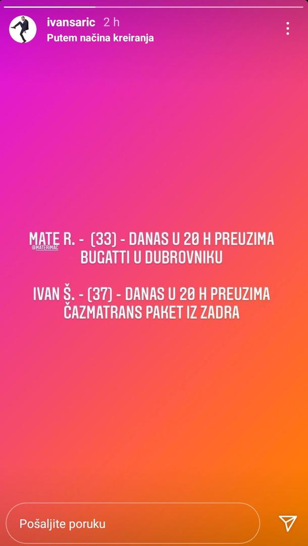 Komičar Ivan Šarić na svom se Instagram Storyju našalio na račun poduzetnika i inovatora Mate Rimca. "Mate R. - (33) - danas u 20 sati preuzima Bugatti u Dubrovniku. Ivan Š. - (37) - danas u 20 sati preuzima Čazmatrans paket iz Zadra", napisao je u objavi, a označio je i Rimca.