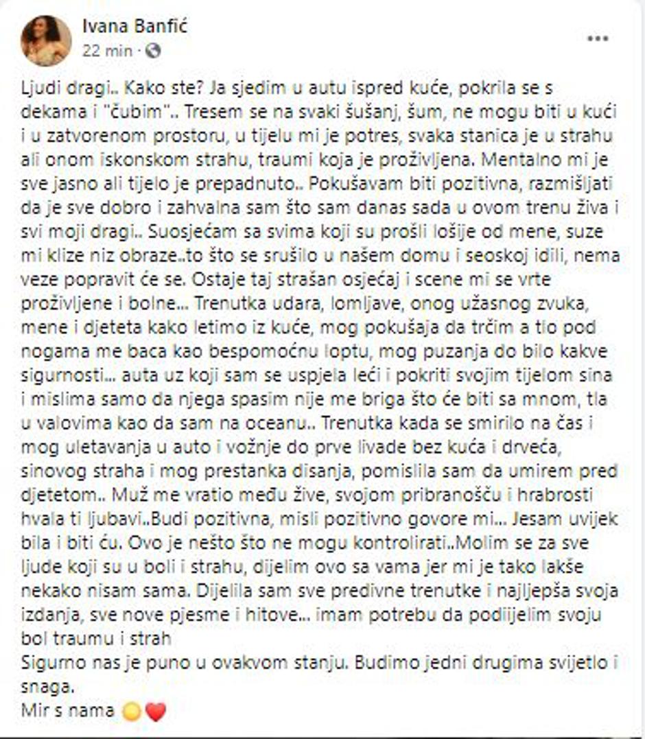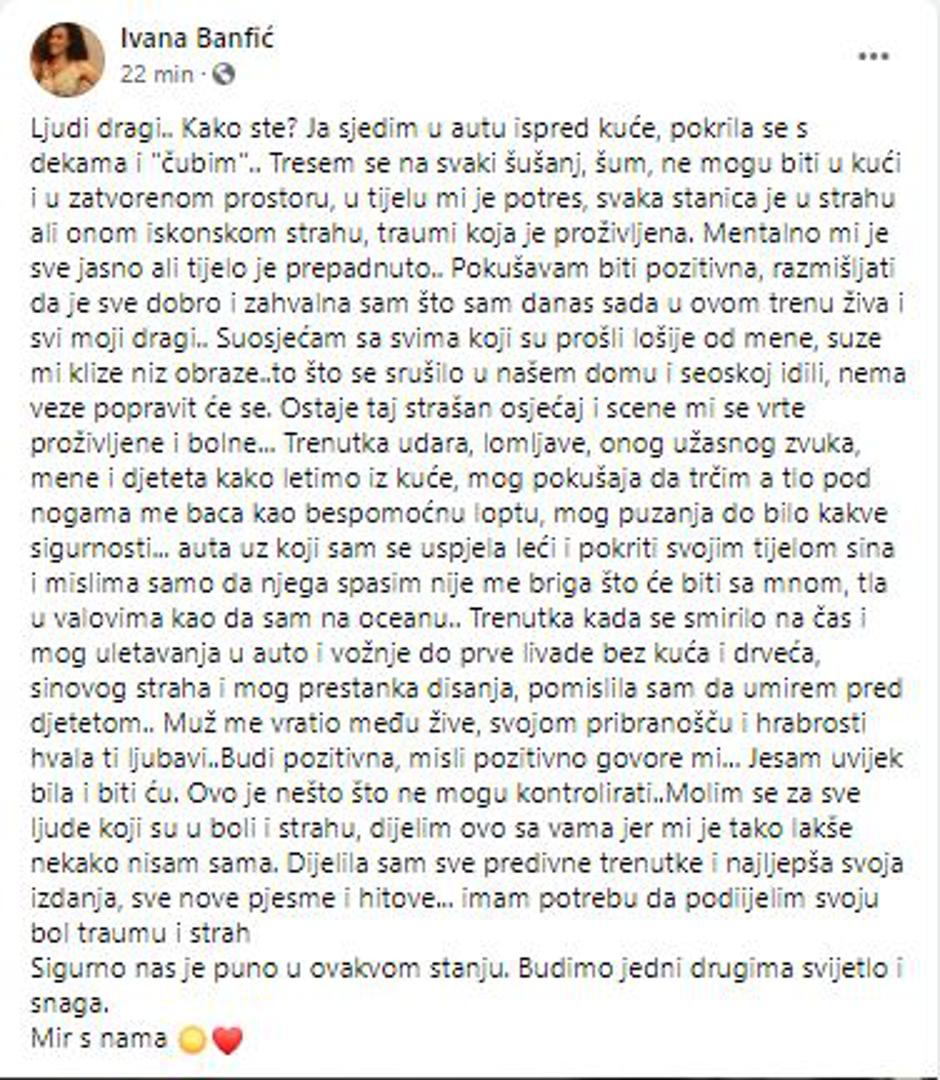 "Ljudi dragi.. Kako ste? Ja sjedim u autu ispred kuće, pokrila se s dekama i "čubim".. Tresem se na svaki šušanj, šum, ne mogu biti u kući i u zatvorenom prostoru, u tijelu mi je potres, svaka stanica je u strahu ali onom iskonskom strahu, traumi koja je proživljena. Mentalno mi je sve jasno ali tijelo je prepadnuto.. Pokušavam biti pozitivna, razmišljati da je sve dobro i zahvalna sam što sam danas sada u ovom trenu živa i svi moji dragi.. Suosjećam sa svima koji su prošli lošije od mene, suze mi klize niz obraze..to što se srušilo u našem domu i seoskoj idili, nema veze popravit će se. Ostaje taj strašan osjećaj i scene mi se vrte proživljene i bolne... Trenutka udara, lomljave, onog užasnog zvuka, mene i djeteta kako letimo iz kuće, mog pokušaja da trčim a tlo pod nogama me baca kao bespomoćnu loptu, mog puzanja do bilo kakve sigurnosti... auta uz koji sam se uspjela leći i pokriti svojim tijelom sina i mislima samo da njega spasim nije me briga što će biti sa mnom, tla u valovima kao da sam na oceanu.. Trenutka kada se smirilo na čas i mog uletavanja u auto i vožnje do prve livade bez kuća i drveća, sinovog straha i mog prestanka disanja, pomislila sam da umirem pred djetetom.. Muž me vratio među žive, svojom pribranošču i hrabrosti hvala ti ljubavi..Budi pozitivna, misli pozitivno govore mi... Jesam uvijek bila i biti ću. Ovo je nešto što ne mogu kontrolirati..Molim se za sve ljude koji su u boli i strahu, dijelim ovo sa vama jer mi je tako lakše nekako nisam sama. Dijelila sam sve predivne trenutke i najljepša svoja izdanja, sve nove pjesme i hitove... imam potrebu da podiijelim svoju bol traumu i strah. Sigurno nas je puno u ovakvom stanju. Budimo jedni drugima svijetlo i snaga. Mir s nama", podijelila je Banfić na Facebooku.