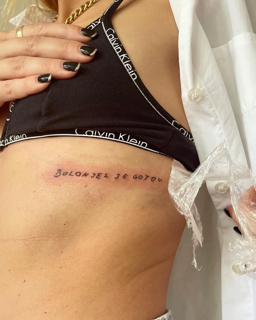 Radijska voditeljica Ivana Mišerić usred pandemije koronavirusa i potresa u Zagrebu ostala je i bez majke. Tuga zbog njezina preranog odlaska i dalje ne blijedi, a sada joj je odlučila odati počast i zanimljivom tetovažom. Naime, Ivana je odmah ispod srca istetovirala posljednje tri riječi koje joj je uputila majka. "Bolonjez je gotov", natpis je na tetovaži koja odnedavno krasi Ivanino tijelo.