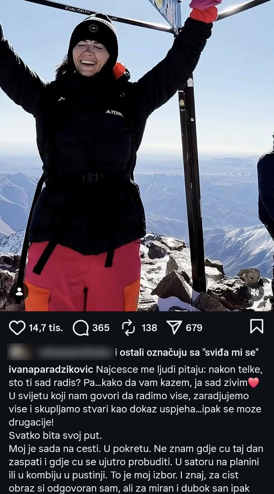 - Najčešće me ljudi pitaju: Nakon telke, što ti sad radiš? Pa…kako da vam kažem, ja sad živim. U svijetu koji nam govori da radimo više, zarađujemo više i skupljamo stvari kao dokaz uspjeha…ipak se može drugačije! Svatko bira svoj put. Moj je sada na cesti. U pokretu. Ne znam gdje ću taj dan zaspati i gdje ću se ujutro probuditi. U šatoru na planini ili u kombiju u pustinji. To je moj izbor. I znaj, za čist obraz si odgovoran sam... - obratila se Ivana mnogobrojnim pratiteljima, koji su joj zatim krenuli postavljati popratna pitanja, a jednog je zanimala njezina financijska pozadina.