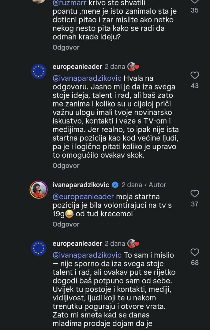 - Ipak nije ista startna pozicija kao kod većine ljudi - konstatirao je, a zatim je uslijedio odgovor: - Moja startna pozicija je bila volontirajući na TV-u s 19 godina. Od tud krećemo - poručila je bivša voditeljica "Provjerenog" koja danas ima firmu i radi kao freelancerica.