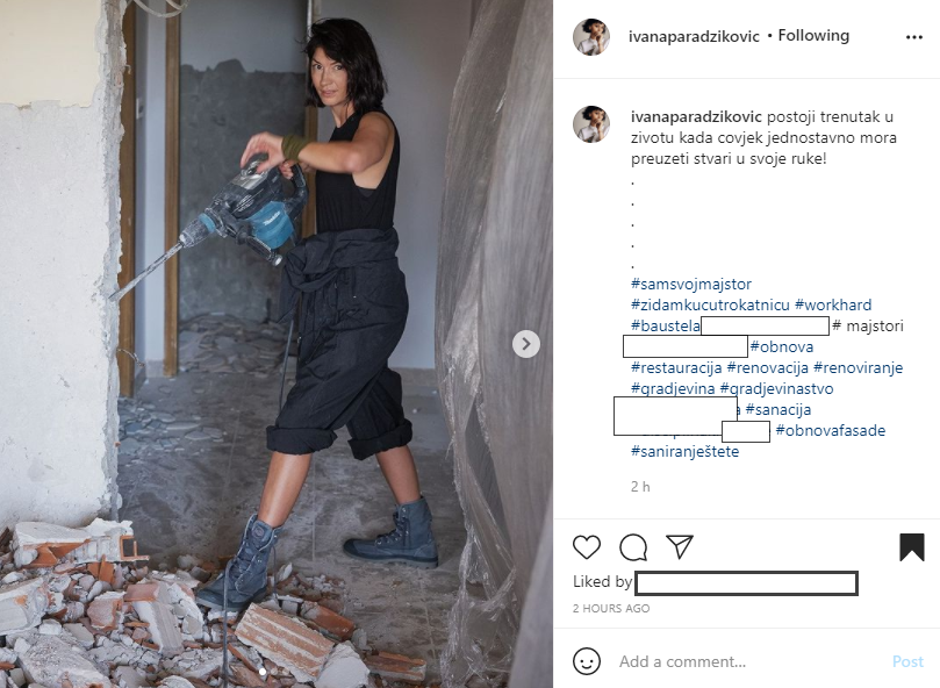 Ivana Paradžiković (40) na svojem je Instagram profilu objavila album fotografija koje su njezine pratitelje oduševile. Naime, novinarka je objavila fotografije na kojima nosi radno odijelo, a vidi se i da je rušila zid. Za potrebe Instagrama pozirala je s bušilicom, a u opisu istaknula da "postoji trenutak u životu kada čovjek jednostavno mora preuzeti stvari u svoje ruke". Dodala je i hashtagove 'sam svoj majstor', 'zidam kuću trokatnicu', 'obnova' i 'građevina'.