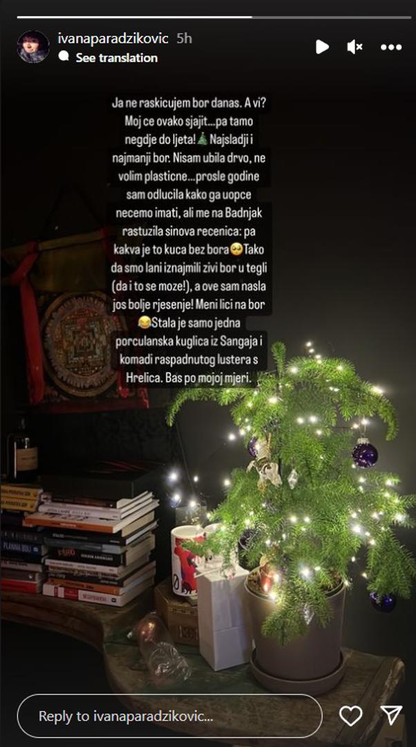- Ja ne raskićujem bor danas. A vi? Moj će ovako sjajiti...pa tamo negdje do ljeta. Najslađi i najmanji bor. Nisam ubila drvo, ne volim plastične... Prošle godine sam odlučila kako ga uopće nećemo imati, ali me na Badnjak rastužila sinova rečenica: Pa kakva je to kuća bez bora. Tako da smo lani iznajmili živi bor u tegli (da i to se može!), a ove sam našla još bolje rješenje. Meni liči na bor. Stane samo jedna porculanska kuglica iz Šangaja i komadi raspadnutog lustera s Hrelića. Baš po mojoj mjeri. - napisala je i objavila na Instagram storyju fotografiju svog bora. Na Badnjak se Ivana prisjetila kako su izgledali blagdani kada je bila mala.