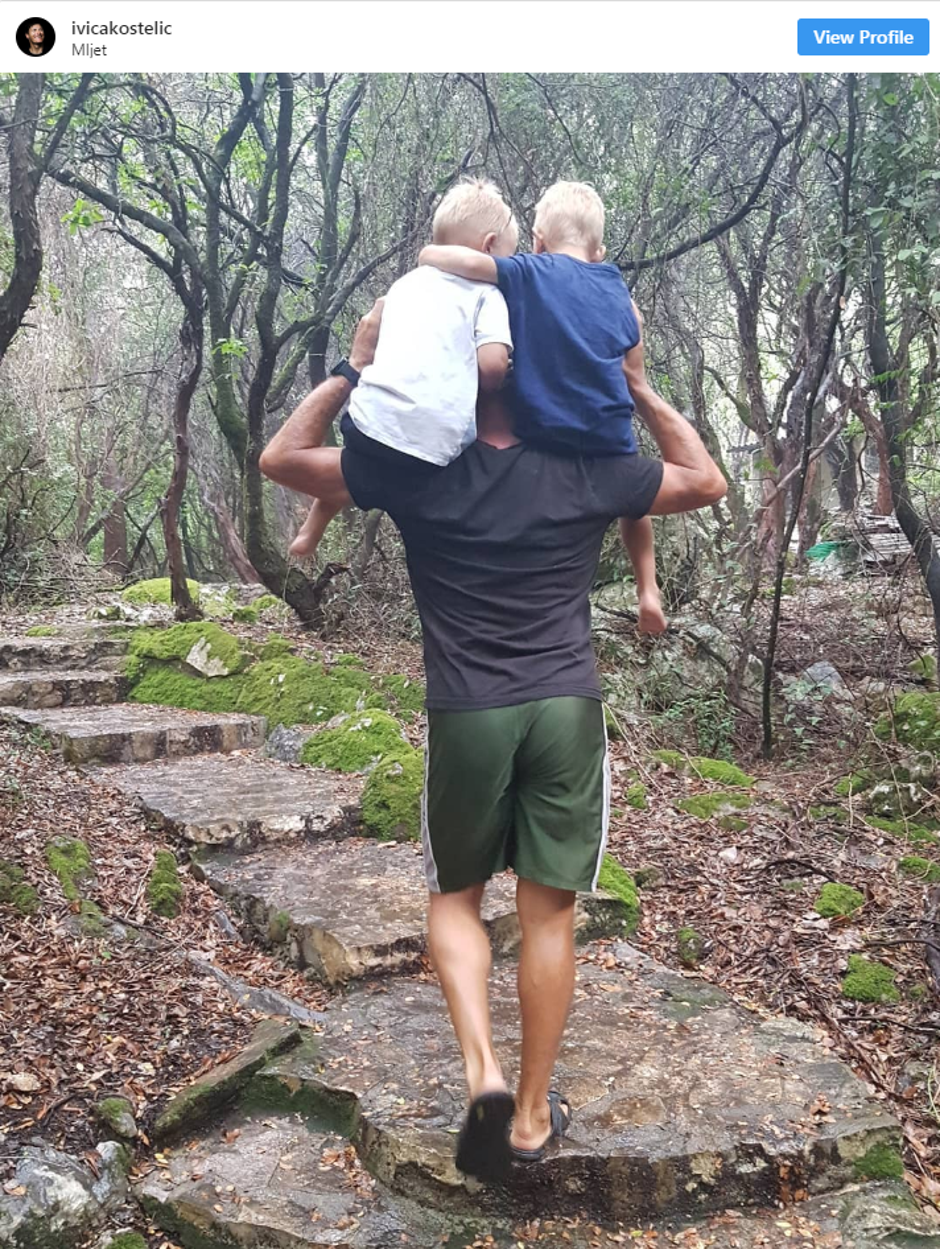 Naime, na fotki je u šumi na Mljetu, a na ramenima nosi sinove, četverogodišnjeg Ivana i trogodišnjeg Leona. Uz objavu je napisao: "Imam cijeli svijet na rukama".