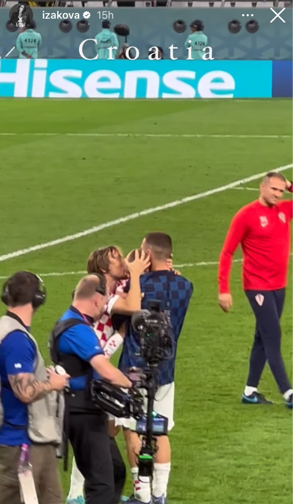 Mateo je Ivana podigao u naručje te izgrlio, a potom je do njih došao i kapetan Luka Modrić koji je malenom Ivanu i krsni kum. Luka je zagrlio Ivana te mu dao pusu, a zatim je zagrlio i Matea. Potom je i Luka krenuo rukom pozivati svoju djecu na teren. Izabel je cijeli prizor snimila i podijelila na svojem Instagram storyju te mnoge raznježila.