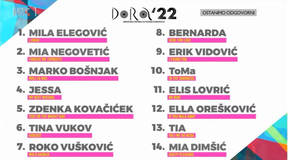 Tko će predstavljati Hrvatsku na ovogodišnjoj Euroviziji saznat ćemo 19. veljače kada će se novih 14 pjesama predstaviti javnosti s pozornice Marino Cvetković u Opatiji i pokušati izboriti odlazak na Euroviziju u Torino. Imena izvođača poznata su već neko vrijeme, ali ne i redosljed njihovih nastupa.