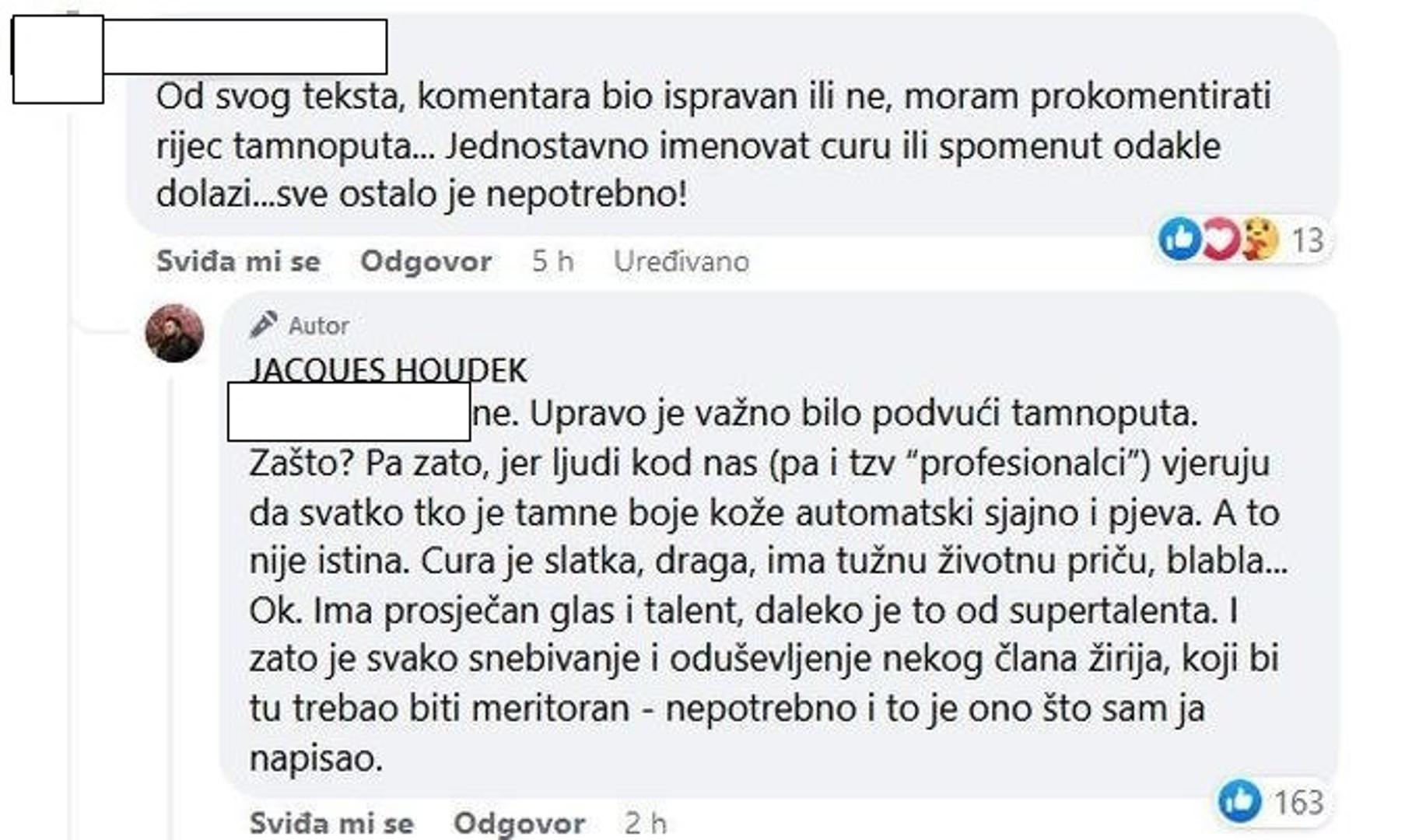 Nakon sinoćnje emisije Supertalenta pjevač Jacques Houdek (41) podigao je golemu prašinu na svom Facebooku komentirajući nastup natjecateljice Digne Mbepere. Houdek je u statusu naglasio i da je djevojka tamnoputa, a upravo to zasmetalo je jednoj njegovoj pratiteljici.
