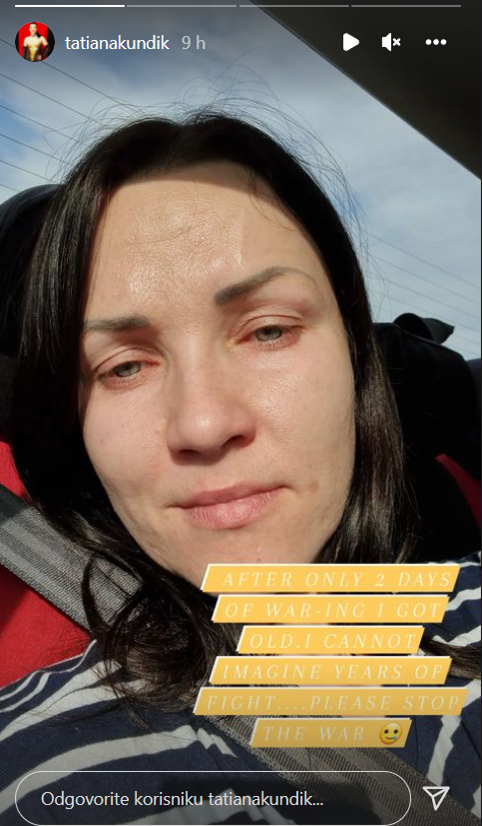 Finalistica showa Tetiana na svojem je Instagram Storyju podijelila fotografiju sa svojim sinom te napisala da bježe. Na sljedećoj fotografija, koja je snimljena u autu, Tetiana je pozirala sama.