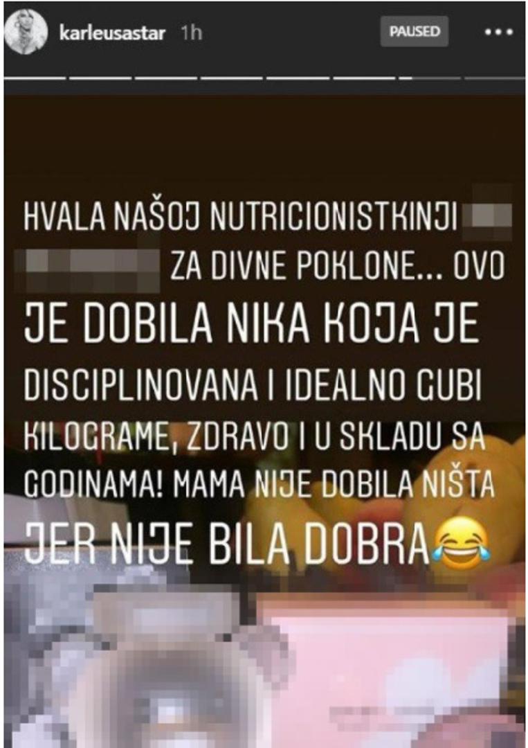 - Hvala našoj nutricionistkinji za divne poklone. Ovo je dobila Nika koja je disciplinirana i idealno gubi kilograme, zdravo i u skladu sa godinama. Mama nije dobila ništa jer nije bila dobra - napisala je Karleuša na Instagramu.