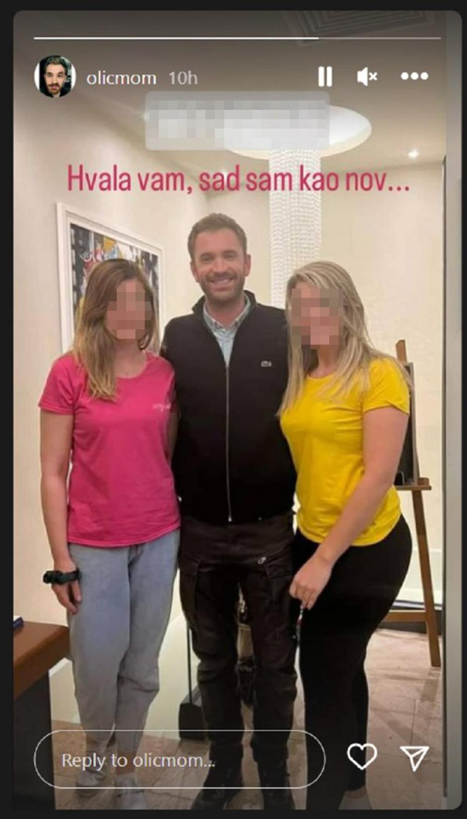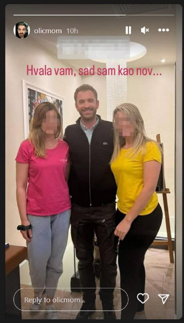 Dok je Jelena pozirala fotografima na premijeri u zagrebačkom kinu, Momčilo se javio na Instagramu te tako otkrio gdje se on nalazi. Na svojem Instagram storyju otkrio kako se nalazi u Crnoj Gori u jednom centru za fizikalnu terapiju te je pozirao u društvu dvije dame za koje se pretpostavlja da su djelatnice tog centra. „Hvala vam, sad sam kao nov“, poručio je u opisu fotografije na kojoj ima veliki osmijeh.