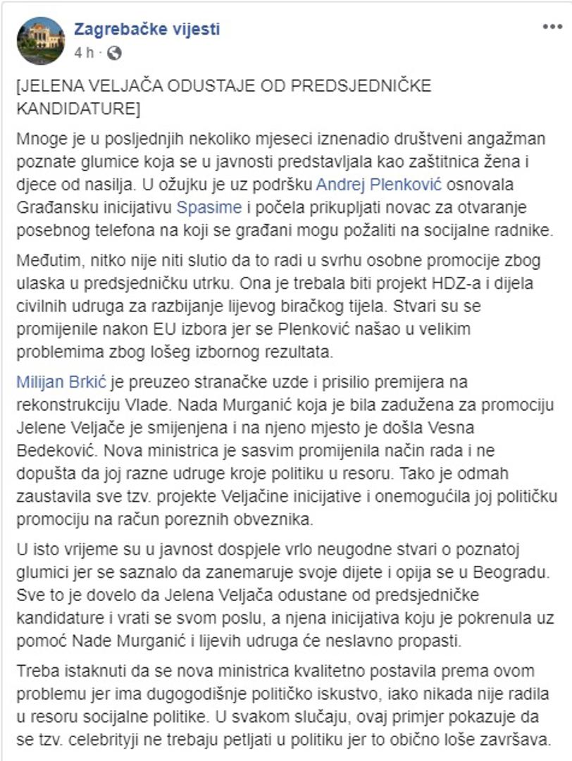Na Facebook stranici Zagrebačke vijesti osvanula je danas objava s naslovom kako Jelena Veljača odustaje od predsjedničke kandidature. U objavi između ostaloga piše kako je producentica u ožujku osnovala građansku inicijativu #Spasime uz podršku premijera Andreja Plenković te kako je to napravila u svrhu osobne promocije zbog ulaska u predsjedničku utrku.