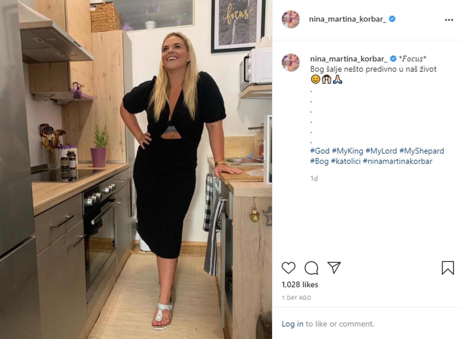 Ovaj put je objavila fotku na kojo se vidi da je u kuhinji, a pozirala je u zanimljivoj kombinaciji. Naime, Nina Martina odjenula je haljinu koja ima duboki dekolte i prorez na trbuhu, te se u njoj stvarno vidi da je smršavjela. Uz fotku koja je skupila već više od tisuću lajkova napsiala je: "Bog šalje nešto predivno u naš život".