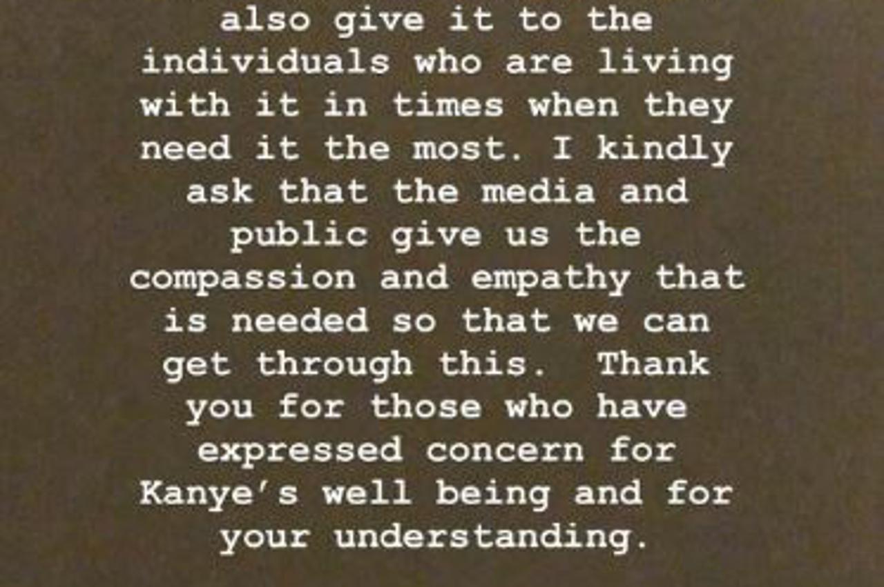 Iako je prošlo već nekoliko dana od početka Kanyeovog 'čudnog' ponašanja nitko iz klana Kardashian-Jenner se tri dana nije oglasio na društvenim mrežama i ne žele ništa komentirati za medije. Sve se promijenilo danas kada je Kim odlučila napisati podužu objavu na Insagramu. Podsjetila je pratitelje da se Kanye bori s bipolarnim poremečajem i da je situacija jako teška za cijelu obitelj. "Oni koji razumiju mentalne bolesti ili kompulzivno ponašanje znaju da je obitelj bespomoćna osim ako je riječ o maloljetniku. Znam da je Kanye predmet kritika jer je javna osoba, a njegovi postupci izazivaju snažne emocije i razmišljanja. On je genijalna, ali komplicirana osoba koja uz pritisak da bude tamnoputi umjetnik osjeća bol zbog gubitka majke te se nosi s pritiskom izolacije pojačanim njegovim bipolarnim poremećajem. Oni koji su bliski s njim znaju njegovu dušu i shvaćaju da se njegove riječi ponekad ne poklapaju s njegovim namjerama" napsala je Kim u objavi te zamolila medije, pratitelje i obožavatelje da budu suosjećajni i empatični.