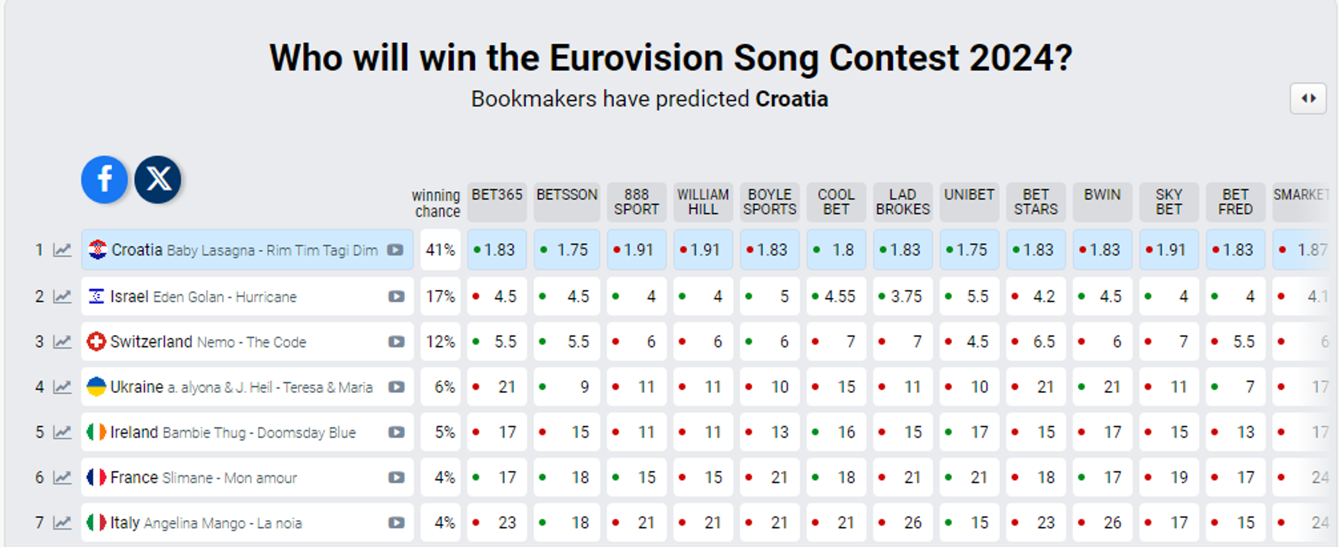 Baby Lasagna od samog početka veliki je favorit ovog Eurosonga, a na kladionicama je još uvijek prvi s 41 posto. No promijenio se poredak drugih zemalja i iznenada je skočio Izrael koji je sad drugi sa 17 posto šanse za pobjedu. Treća je Švicarska, četvrta Ukrajina, a peta Irska. Italija i njihova predstavnica Angelina Mango, koja je bila cijelo vrijeme Marku za petama, sada je tek na sedmom mjestu.