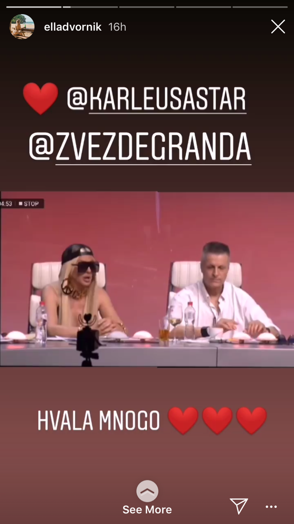 Karleuša se u showu Zvezde Granda, gdje je jedna od članica žirija, osvrnula na izvedbu natjecateljice koja se odlučila na Ellinu izvedbu te je nahvalila.