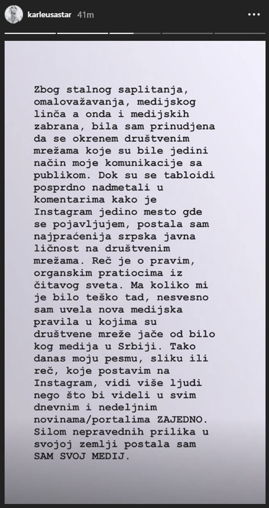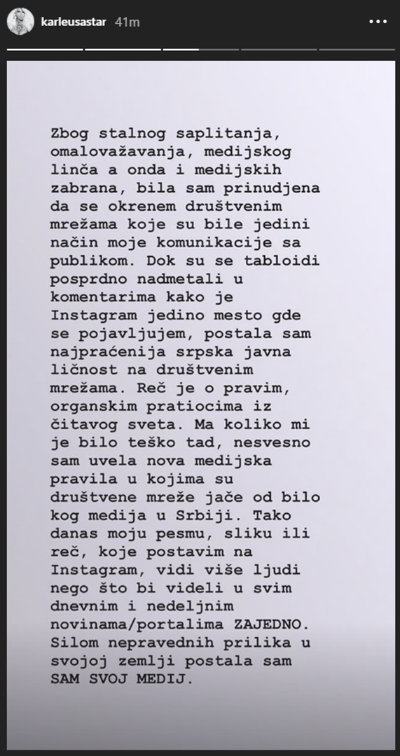 - Zbog stalnog saplitanja, omalovažavanja, medijskog linča, a onda i medijskih zabrana, bila sam primorana okrenuti se društvenim mrežama koje su bile jedini način moje komunikacije s publikom. Dok su se mediji nadmetali u komentarima kako je Instagram jedino mjesto gdje se pojavljujem, postala sam najpraćenija srpska javna osoba na društvenim mrežama. Riječ je o pravim pratiteljima iz cijelog svijeta. Koliko god mi je tada bilo teško, nesvjesno sam uvela nova medijska pravila u kojima su društvene mreže jače od bilo kojeg medija u Srbiji. Tako danas moju pjesmu, sliku ili riječ, vidi više ljudi nego što bi vidjeli u svim medijima zajedno. Zbog nepravde sam u svojoj zemlji postala sam svoj medij - poručila je Karleuša u svom Instagram storyju.