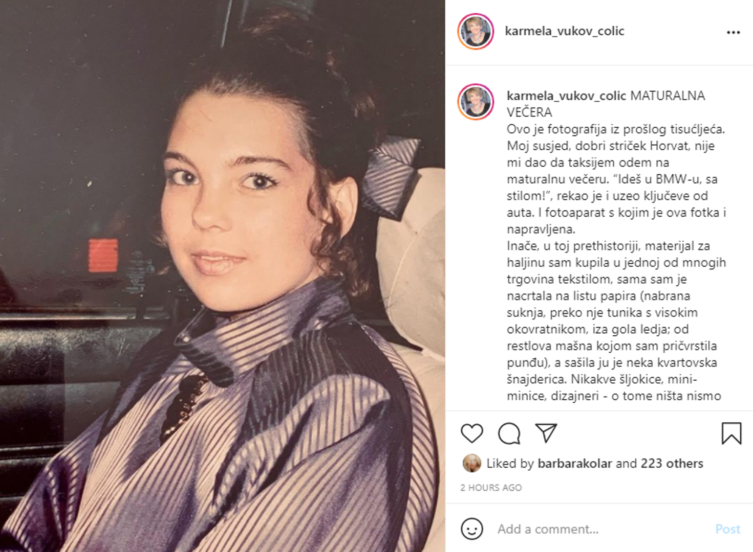 – Ovo je fotografija iz prošlog tisućljeća. Moj susjed, dobri striček Horvat, nije mi dao da taksijem odem na maturalnu večeru. “Ideš u BMW-u, sa stilom”, rekao je i uzeo ključeve od auta. I fotoaparat s kojim je ova fotka i napravljena. Inače, u toj prethistoriji, materijal za haljinu kupila sam u jednoj od mnogih trgovina tekstilom, sama sam je nacrtala na listu papira (nabrana suknja, preko nje tunika s visokim okovratnikom, iza gola leđa; od restlova mašna kojom sam pričvrstila punđu), a sašila ju je neka kvartovska šnajderica. Nikakve šljokice, mini-minice, dizajneri – o tome ništa nismo znali – započela je Karmela opisujući kako je onda tekla noć koje će se sjećati cijeli život.
