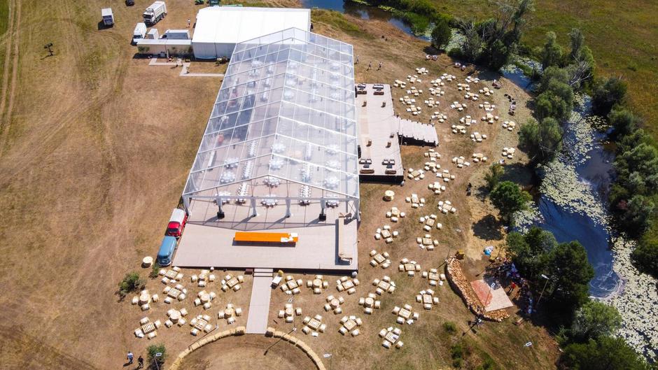 Ispred šatora su stolovi na travi koji su napravljeni od sijena i sve je u duhu teme vjenčanja koja je posvećena prirodi.