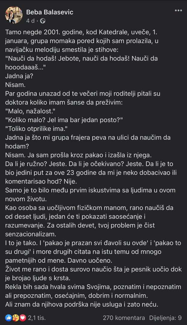 -Tamo negdje 2001. godine, kod katedrale, predvečer, 1. siječnja, grupa dečkiju pored kojih sam prolazila, u navijačku melodiju smjestila je stihove: “Nauči se hodati! Je**te, nauči se hodati! Nauči se hodati…” Jadna ja? Nisam. Par godina unazad od te večeri moji roditelji pitali su doktora koliko imam šanse da preživim: “Malo, nažalost- napisala je Beba.