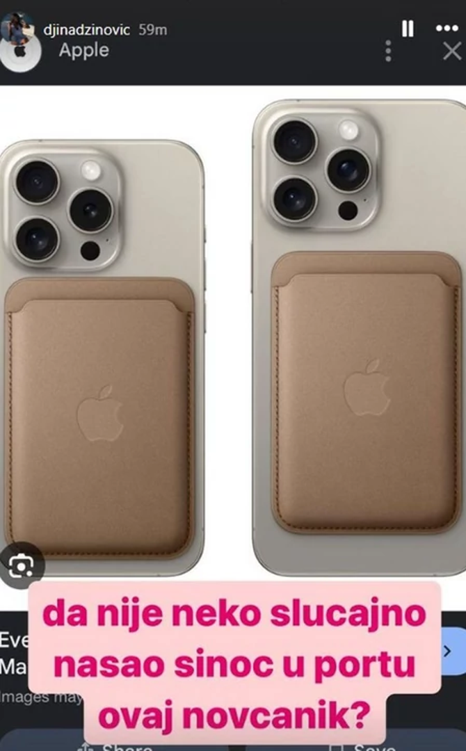 Atraktivna 20-godišnja kći Haris Džinovića, Đina Džinović otkrila je da je prije nekoliko dana doživjela veliku neugodnost u Crnoj Gori. Naime, na društvenoj mreži Instagram objavila je kako je izgubila novčanik. Za pomoć se obratila svojim pratiteljima te je pokazala sliku istog i napisala: - Da nije netko slučajno našao sinoć u Portu ovaj novčanik? - glasilo je pitanje mlade Đine uz fotografiju pametnog iPhone novčanika koji se lijepi na mobilni uređaj.