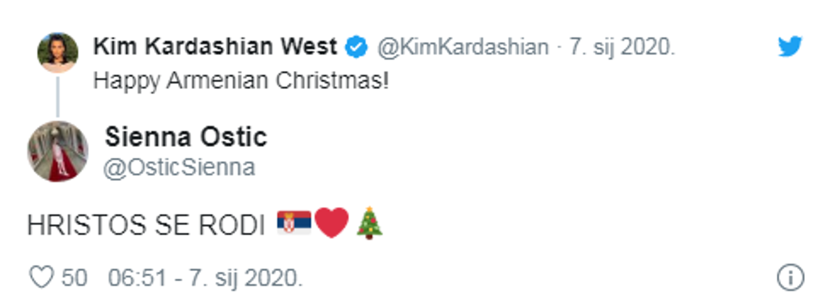 "Sretan armenski Božić", napisala je Kim čiji je pokojni otac Robert porijeklom iz Armenije. "I srpski", komentirali su obožavatelji iz Srbije i odgovorili joj: "Hristos se rodi!"