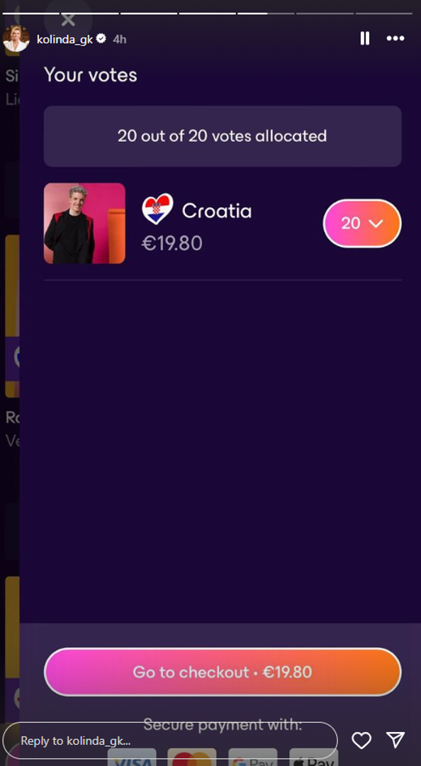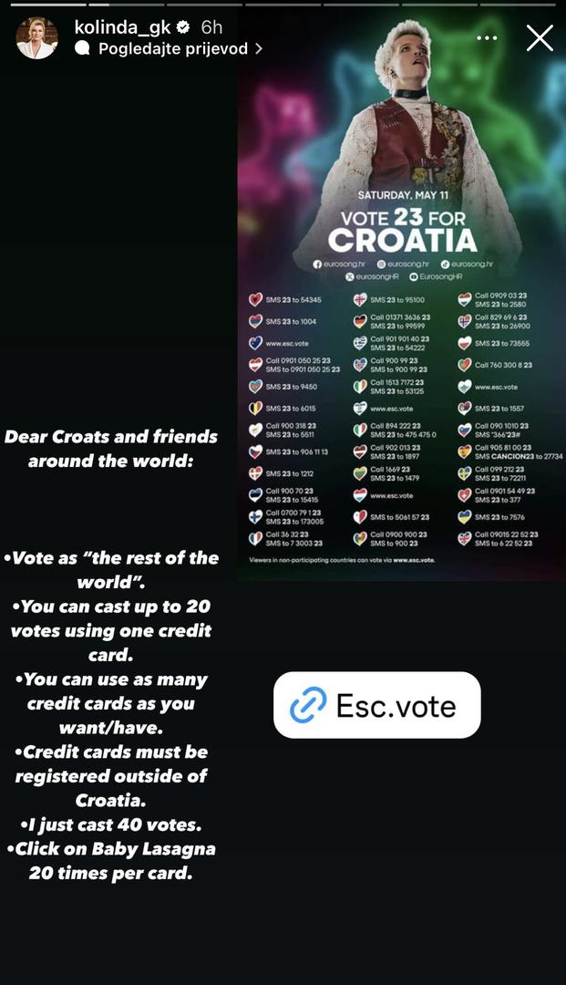 - Dragi Hrvati i prijatelji iz svijeta, glasajte kao ‘Rest of the World‘. Možete poslati do 20 glasova koristeći jednu kreditnu karticu. Možete koristiti koliko god kreditnih kartica imate/želite. Kreditne kartice moraju biti registrirane izvan Hrvatske. Ja sam poslala 40 glasova. Kliknite na Baby Lasagnu 20 puta po kartici - pozvala je Kolinda svoje pratitelje na Instagramu.