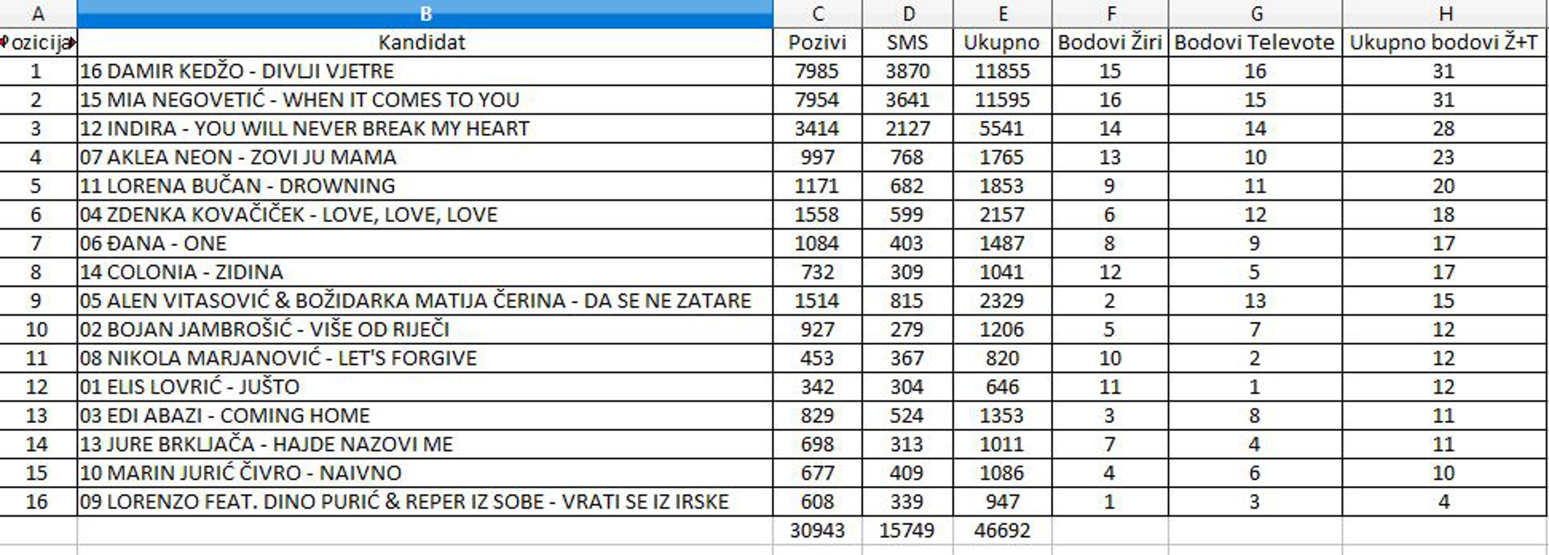 Tijekom desetominutnog glasovanja putem telefonskih poziva i SMS poruka pristiglo je ukupno 46 692 telefonskih i SMS glasova.