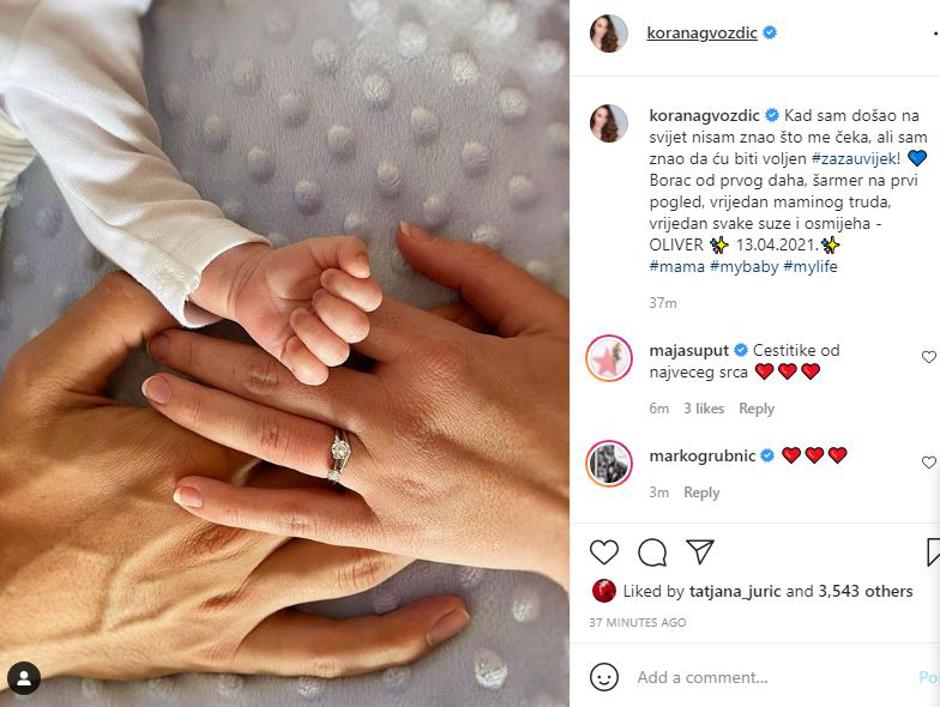 To je bilo samo dva mjeseca prije nego li je na svijet donijela sina Olivera. Naime, Korana je na svom Instagramu objavila da je rodila, a datum je stavila 13. travnja ove godine.