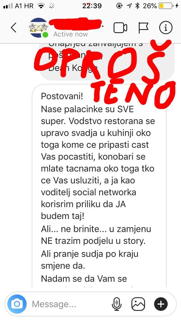 Kotiga se, kako je i najavio, doista javio porečkom restoranu, a ubrzo je stigao i odgovor. - Poštovani, naše palačinke su sve super. Vodstvo restorana se upravo svađa u kuhinji oko toga kome će pripasti čast počastiti vas, konobari se mlate tacnama oko toga tko će vas uslužiti, a ja kao voditelj social networka koristim priliku da ja budem taj! Ali, ne brinite, u zamjenu ne tražim podjelu na story. Ali pranje suđa na kraju smjene da. Nadam se da vam se ponuda sviđa te da ćete je znati ugrabiti. S dvije ruke... U jednoj spužva, u drugoj sapun. Unaprijed zahvaljujemo na interesu - uzvratili su mu i na kraju dodali kako doista časte palačinkama. - Već sam javio vlasnicima - dodao je voditelj društvenih mreža uz emotikonu smajlića.