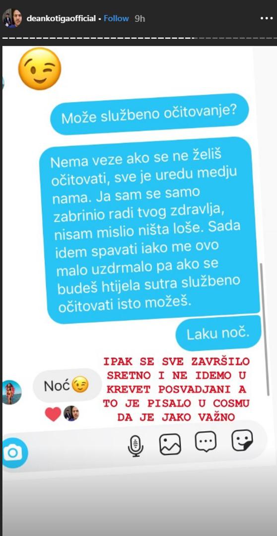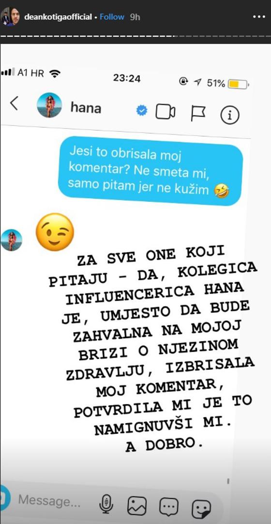 – Ja sam samo napisao da se ne prehladi,a ona je izbrisala te komentare i ostavila samo one koji govore o njenoj lijepoj guzici, i to nije fer da se neki komenari brišu. A vi svi koji mi šaljete negativne komentare o njoj, reći ću da to nije lijepo, i dalje brinemo za nju iako se oholo ponaša prema svima nama. Moji osjećaji su malo narušeni – rekao je Dean u Instagram Storyju i objavio poruke iz inboxa.