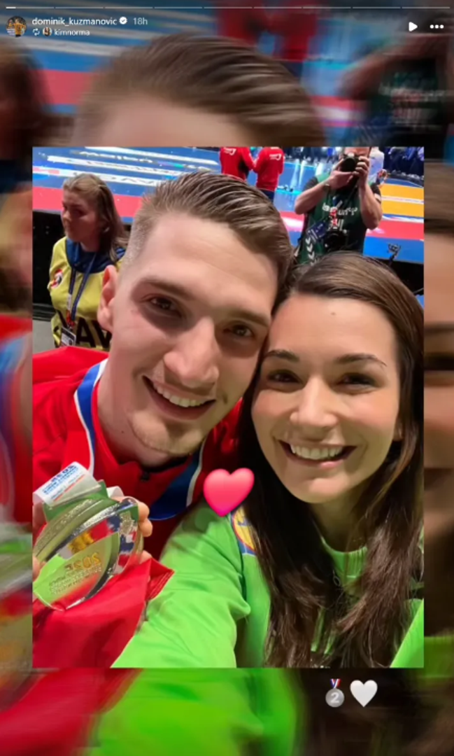 Vratar hrvatske rukometne reprezentacije, Dominik Kuzmanović (23), podijelio je na društvenim mrežama prvu zajedničku fotografiju s djevojkom Kim Normom Müller, čime je još jednom potvrdio svoju sreću u ljubavi. Dok se Hrvatska raduje povratku srebrnih rukometaša i spektakularnom dočeku na Trgu bana Jelačića, mladi vratar raznježio je svoje obožavatelje emotivnom objavom. Njegova djevojka bila mu je velika podrška tijekom cijelog prvenstva, a sada su svoju ljubav odlučili podijeliti i s javnošću.